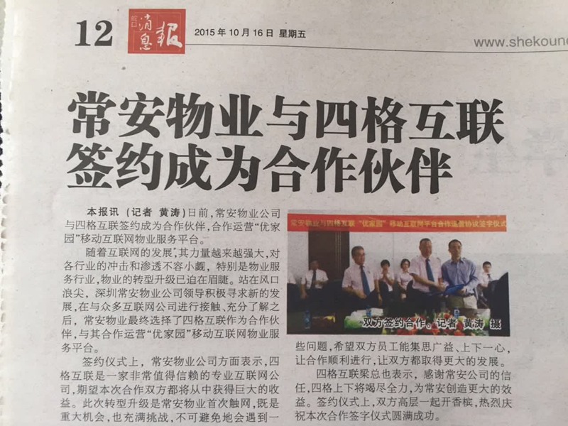 隨著互聯網的發(fā)展,其力量越來越強大,對各行業(yè)的沖擊和滲透不容小覷,特別是物業(yè)服務行業(yè),物業(yè)的轉型已迫在眉睫。站在風口浪尖,公司領導積極尋求新的發(fā)展,在與眾多互聯網公司進行接觸、充分了解之后,公司最終選擇了四格互聯作為合作伙伴,與其共同經營“優(yōu)家園”。