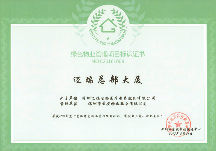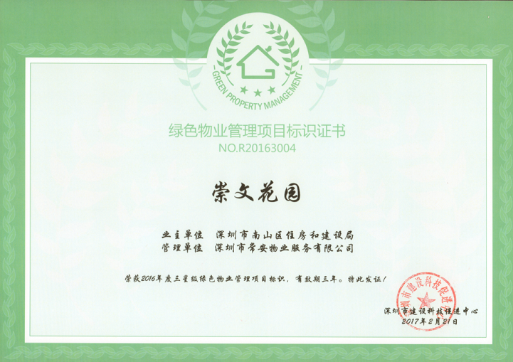 為落實深圳市住建局關(guān)于《深圳市綠色物業(yè)管理導則(試行)》指導精神,在保證物業(yè)服務質(zhì)量等基本要求的前提下,通過科學管理、技術(shù)改造和行為引導,有效降低各類物業(yè)運行能耗,最大限度地節(jié)約資源和保護環(huán)境,致力構(gòu)建節(jié)能低碳生活社區(qū)的物業(yè)管理活動,實現(xiàn)城市經(jīng)濟社會可持續(xù)發(fā)展目標,提高物業(yè)管理的科技含量和服務水平。201612月,在公司的正確領(lǐng)導和相關(guān)部門的積極配合下,通過項目全體員工的共同努力,我司“崇文花園”項目和“邁瑞總部大廈”項目順利通過了深圳市建設科技促進中心的相關(guān)評審,分別獲得了“2016年度三星級綠色物業(yè)管理項目”證書和“2016年度一星級綠色物業(yè)管理項目”證書。