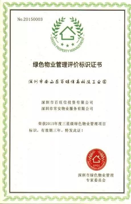 依據(jù)2011 年深圳出臺的首部《深圳市綠色物業(yè)管理導(dǎo)則(試行)》和 2013 年出臺的《深圳市綠色物業(yè)管理項目評價辦法和細(xì)則(試行)》,常安物業(yè)積極響應(yīng)并開展綠色物業(yè)管理工作,2016 年至今,共有四個項目榮獲了深圳市政府部門頒發(fā)的綠色物業(yè)管理項目證書,其中崇文花園還被深圳市政府部門列為深圳市綠色物業(yè)管理項目參觀基地,2019年出任廣東省綠色供應(yīng)鏈協(xié)會綠色物業(yè)管理專業(yè)委員會副主任委員單位。色物業(yè)管理