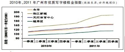 據(jù)中原地產(chǎn)數(shù)據(jù)顯示,2011 年廣州市寫字樓租金升幅大約在5%左右, 但年預(yù)計(jì)會有新增項(xiàng)目持續(xù)入市(特別是珠江新城),所以租金受龐大的新增量壓力影響,難以大幅上升。
