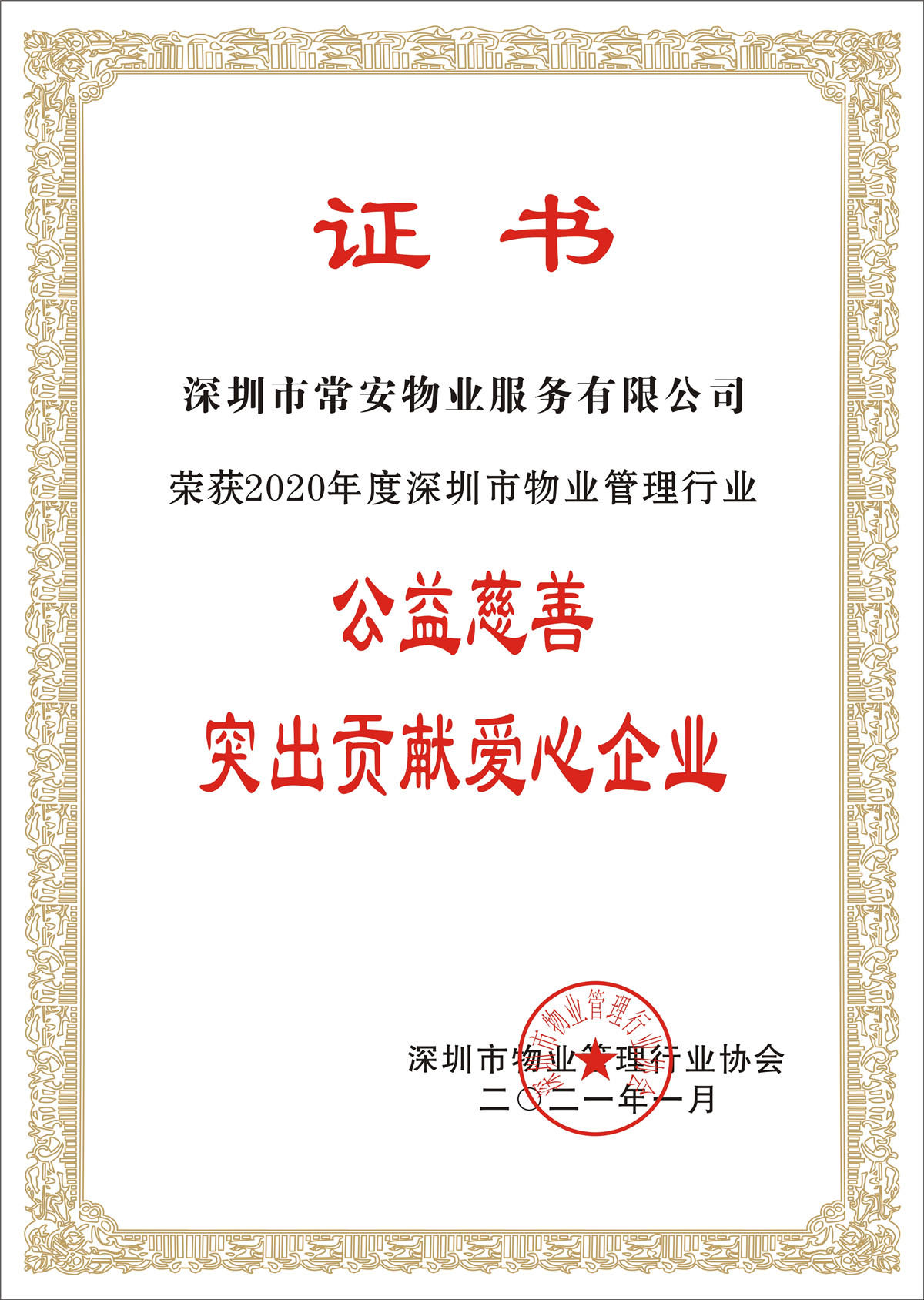 為貫徹國(guó)家脫貧攻堅(jiān)整體部署,響應(yīng)政府、行業(yè)黨委、協(xié)會(huì)等有關(guān)部門號(hào)召,在發(fā)展企業(yè)經(jīng)營(yíng)的同時(shí),深圳市常安物業(yè)服務(wù)有限公司弘揚(yáng)中華民族團(tuán)結(jié)互助、扶貧濟(jì)困的精神,積極履行自身的社會(huì)責(zé)任。為表彰常安物業(yè)在公益慈善方面的突出貢獻(xiàn),深圳市物業(yè)管理行業(yè)協(xié)會(huì)特授予常安物業(yè)“2020年度深圳市物業(yè)管理行業(yè)公益慈善突出貢獻(xiàn)愛(ài)心企業(yè)”榮譽(yù)稱號(hào)。